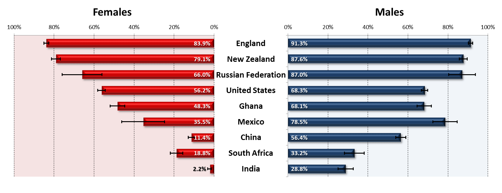 Drinking in older adults appears to be closely tied to wealth. We found that the proportion of older adults that drink is much higher in Western countries (e.g., the U.S., England and New Zealand) than non-Western countries. Additionally, while evidence shows that older men are more likely to drink than older women, this disparity is far smaller in Western countries than it is in non-Western countries.
